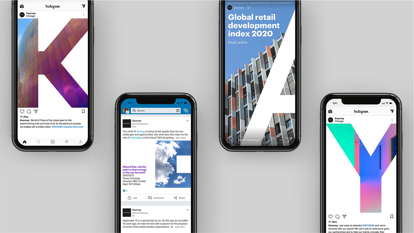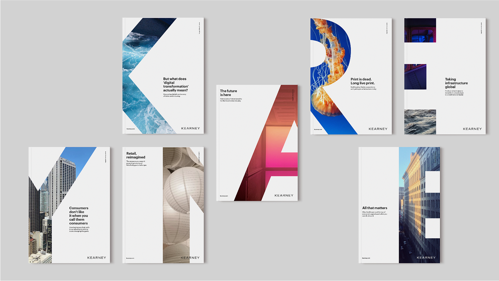 The idea was to shift focus from one founder to the many characters that make up Kearney. By dropping the initials, the new name celebrated the collective strength of its people. A fresh design system ‘captured the character within the characters,’ with the logotype becoming a framework for crowdsourced employee photography.