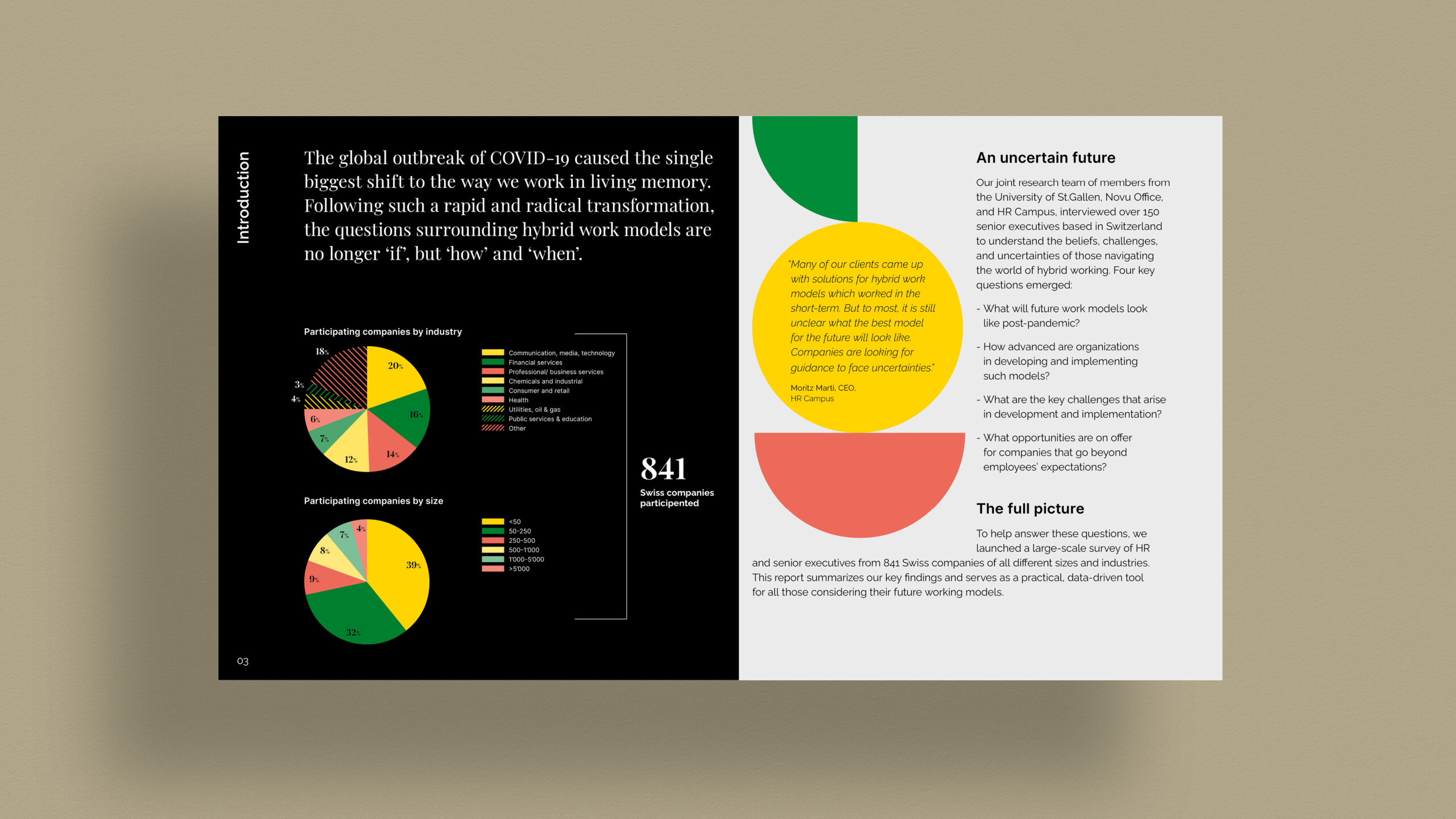 We worked closely with the team to transform this study into a compelling business report showcasing the different office working models. We designed the editorial layout around modular building blocks, to visually represent ‘finding the right fit and balance for their clients business’. The overall design was also a neutral blend of their identities to highlight the partnership of the report.