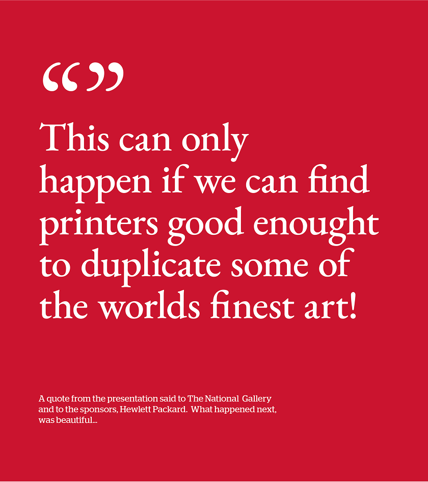 With Hewlett-Packard as a partner, we set them the challenge: could their printers reproduce the world’s greatest masterpieces with stunning accuracy? The answer was yes. Over the course of one summer, 44 replicas lined the streets of Soho, Piccadilly and Covent Garden, transforming the West End into an open-air gallery.